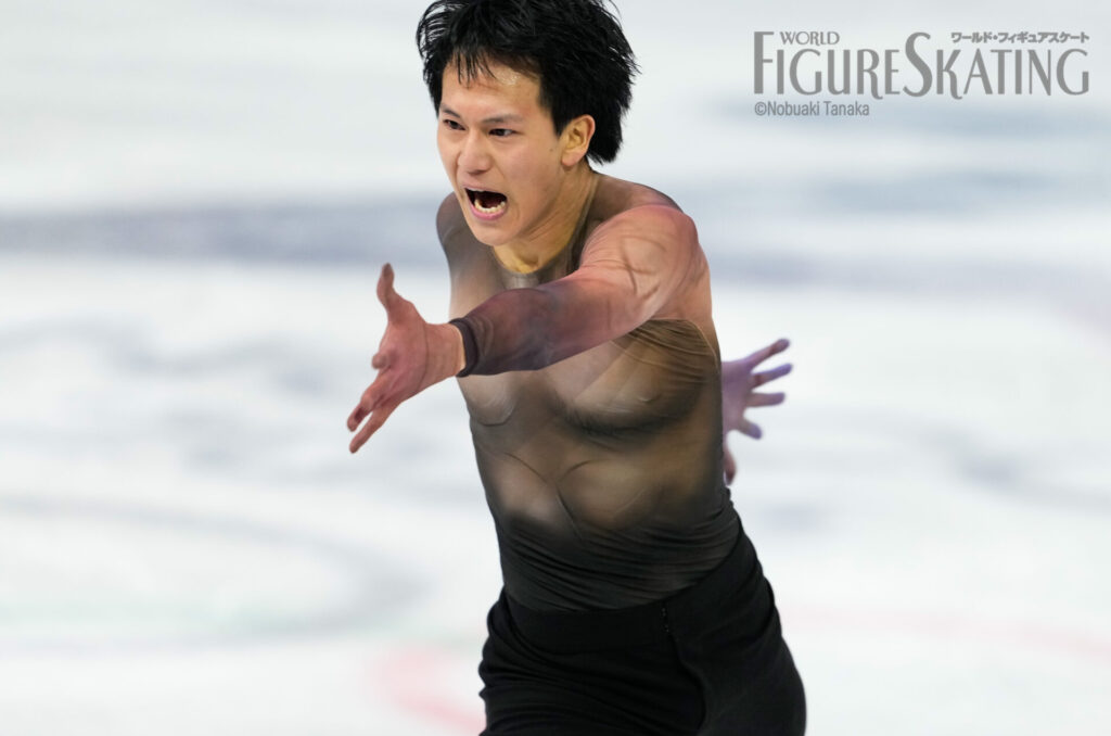 上位3人が100点を超えるなか、ダニエル・グラッスル(イタリア)が93.46点で4位、ミハイル・シャイドロフ(カザフスタン)が92.94点で5位、チャ・ジュンファン(韓国)が92.72点で6位。中位勢がケヴィン・エイモズ(フランス)、アンドルー・トルガシェフ(アメリカ)、佐藤駿、スティーヴン・ゴゴレフ(カナダ)と僅差で続くなかで、スマッシュヒットとなったのがキリロ・マルサク(ウクライナ)。自己ベストを10点近く更新する会心の出来で11位に。国際大会に久しぶりに出場するピョートル・グメンニク(AIN)は4フリップ+2トウ、4ルッツなど大技を決めるも演技構成点が伸びきらずに12位です。