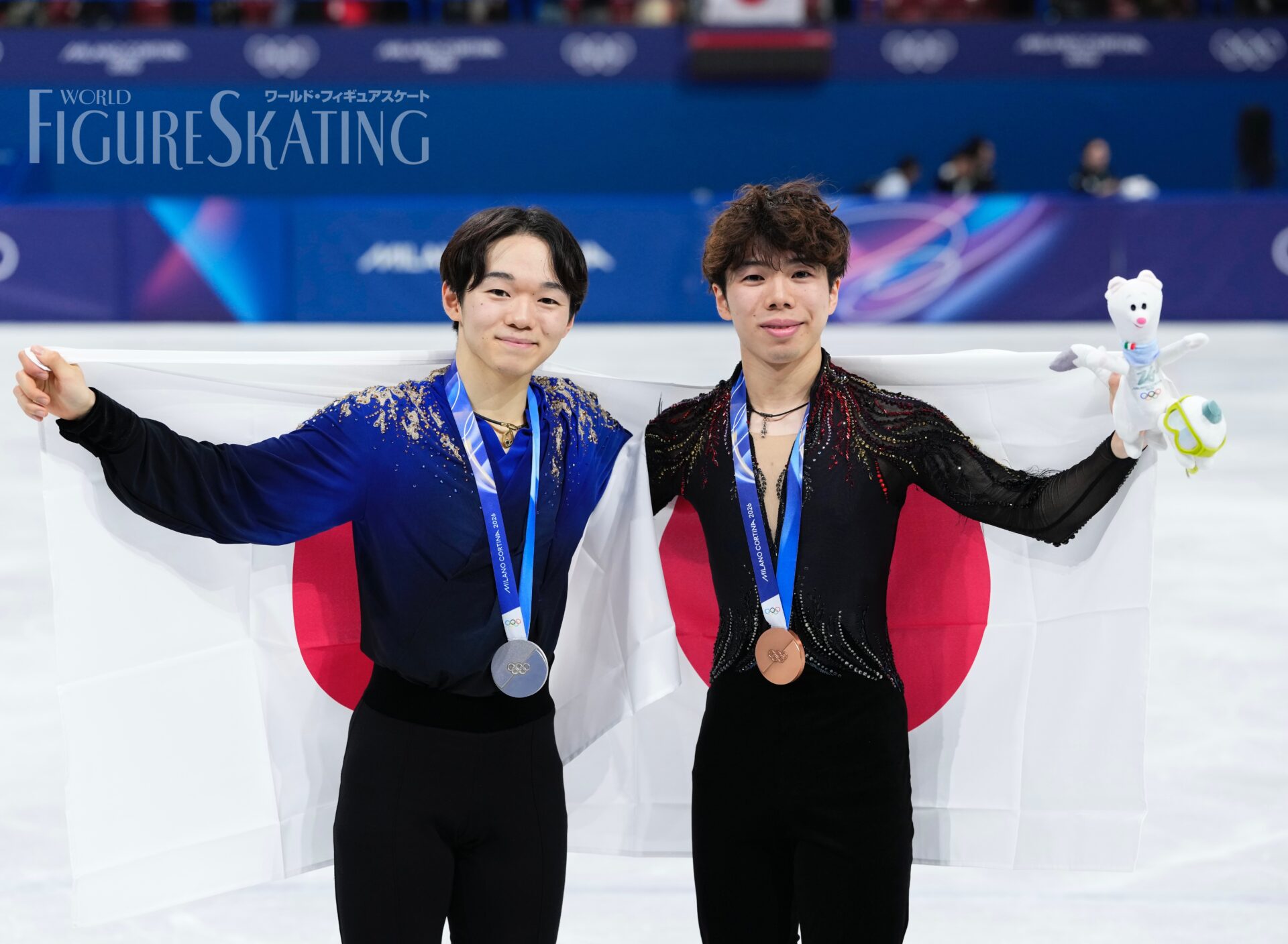 SP2位の鍵山優真は、フリー冒頭の4サルコウの着氷が乱れ、4フリップでは転倒を喫するも、イタリアの観客からの声援にこたえてミスを引きずらないトップスケーターらしい演技を展開、合計280.06点で前回大会に続いての銀メダルを獲得した。佐藤駿はSP9位から追い上げ、ほとんどミスのない演技をしっかりとまとめ上げて、合計274.90点で銅メダルに輝いた。幼いころから競い合ってきた”ゆましゅん”が波乱のなか自分たちの実力を発揮し、表彰台に並び立つうれしい結末。日本男子の複数メダル獲得は、2018年平昌大会(羽生結弦が金、宇野昌磨が銀)、2022年北京大会(鍵山優真が銀、宇野昌磨が銅)と3大会連続での快挙だ。
