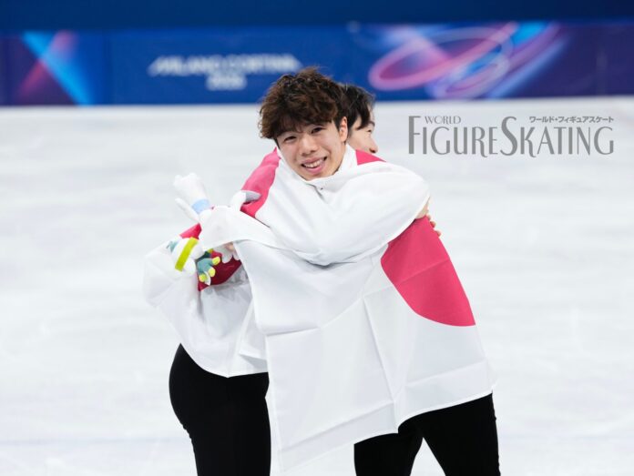 滑り終えて片手を上げるガッツポーズを見せた佐藤は、リンクサイドで日下匡力コーチに抱きしめられた。フリー186.20点、合計274.90点でこの時点でトップに立ち、ミハイル・シャイドロフ(カザフスタン)が上回るまで暫定首位を守った佐藤。そして、最終グループでのイリア・マリニンのまさかの大ブレーキという波乱の展開を経て、佐藤がそのまま3位に踏みとどまるという、結果を見れば本人も予想しなかった大金星につながった。SPのあとの2日間、構成の悩みを三浦佳生と分かち合い、励まし合ったのだという。諦めない精神と、篤い友情が支えたオリンピック銅メダル。表彰式で、両足ジャンプで表彰台に飛び乗った佐藤は、晴れ晴れとした笑顔だった。