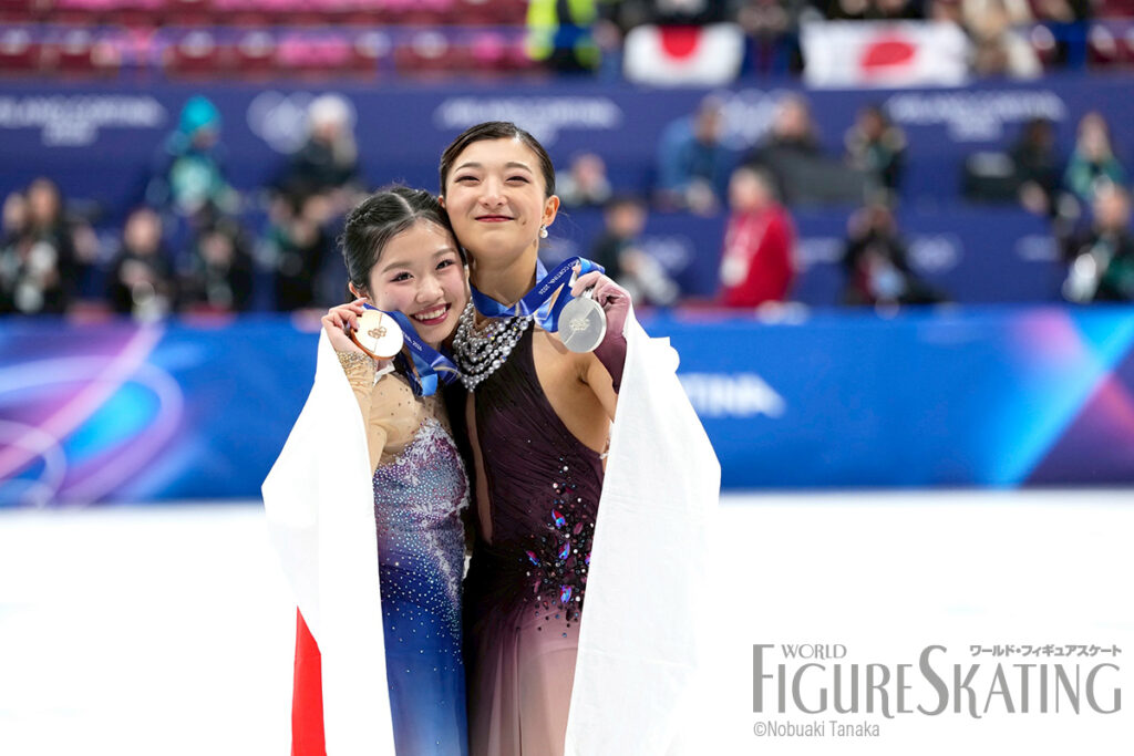 日本女子がオリンピックの1大会でメダル2つを獲得するのは史上初。フィギュアスケートの日本代表全体では、ペアでの三浦璃来&木原龍一組(木下グループ)の金メダル、男子での鍵山優真(オリエンタルバイオ/中京大学)の銀メダルと佐藤駿(エームサービス/明治大学)の銅メダルでメダル2つ、団体戦の銀メダルと、4種目6つのメダルは史上最多となった。