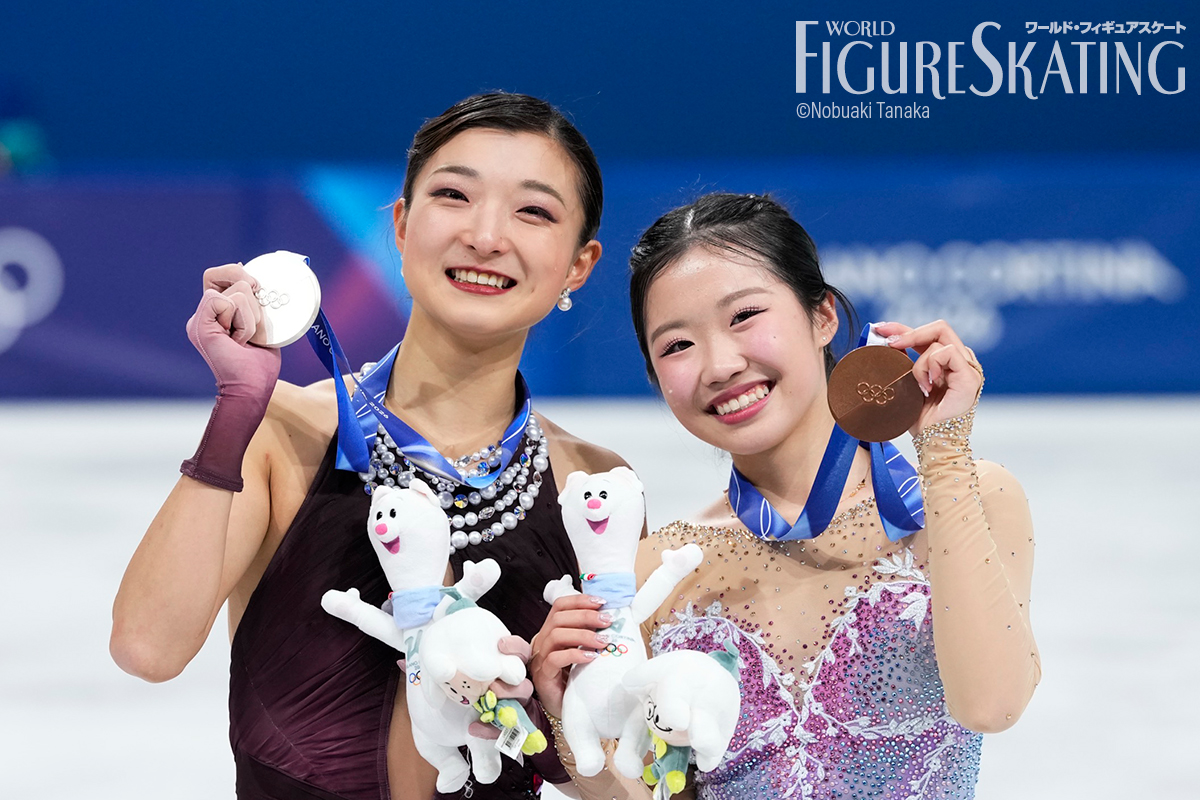 日本女子がオリンピックの1大会でメダル2つを獲得するのは史上初。フィギュアスケートの日本代表全体では、ペアでの三浦璃来&木原龍一組(木下グループ)の金メダル、男子での鍵山優真(オリエンタルバイオ/中京大学)の銀メダルと佐藤駿(エームサービス/明治大学)の銅メダルでメダル2つ、団体戦の銀メダルと、4種目6つのメダルは史上最多となった。