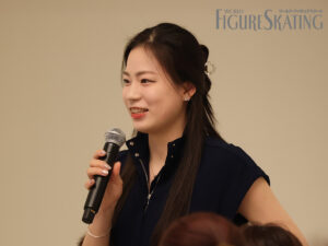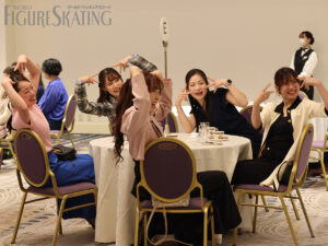 中西は「いつも応援ありがとうございます。2日間終わって、私たちキャストやゲストさんだけではショーは完成しなくて、お客さまから温かい歓声や拍手をいただいてすべてのショーが完結するんだと感じました」と話し、終盤の「Some like it hot」で金のトップハット姿のソロを華やかに舞うナンバーについて、「スタンドマイクで歌って踊るのは難しかったんですけど、普段とは違うところ(特設ステージ)でやっていますので、探していただけたら」と紹介。植杉は「去年は緊張しっぱなしでしたが、今年はふざけるところは思いっきりふざけて、真剣な演技は真剣にと、先輩方から学びながら、集中して頑張れているかなと思います」、佐藤は「レ・ミゼラブル」のマリウス役について「笑顔だけでなく、切なさやコゼットへの思いを意識しながら、役に入りきって滑れたらなと」と話し、それぞれがショーで担う役割や意識など話題は尽きなかった。