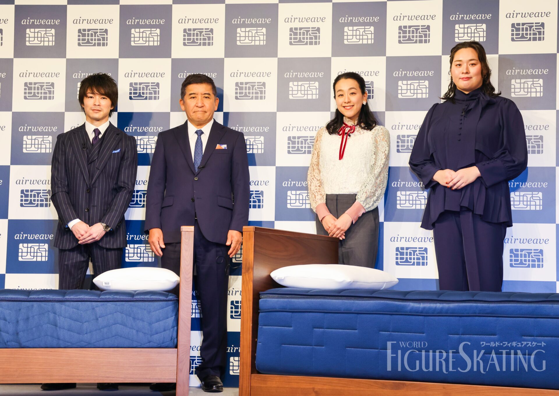 今回発表された主な新商品は、「airweave bedmattress S4.0」、「airweave bedmattress M2.0」、「The airweave」の3つのベッドマットレス。浅田真央、北口榛花、内村航平、高岡本州社長兼会長のアンベールによってお披露目された。高岡会長は、「さまざまな睡眠の悩みを持っている方々に、世界基準の寝具を提供したい。世界市場と、そして日本の人々にもっといい睡眠を提供できたら」とアピールし、新商品開発に向けてベットマットレスの製造技術を見直したこと、海外の顧客に向けてネイビーが基調のラグジュアリーなデザインを採用したことなど、新商品へのこだわりを語った。