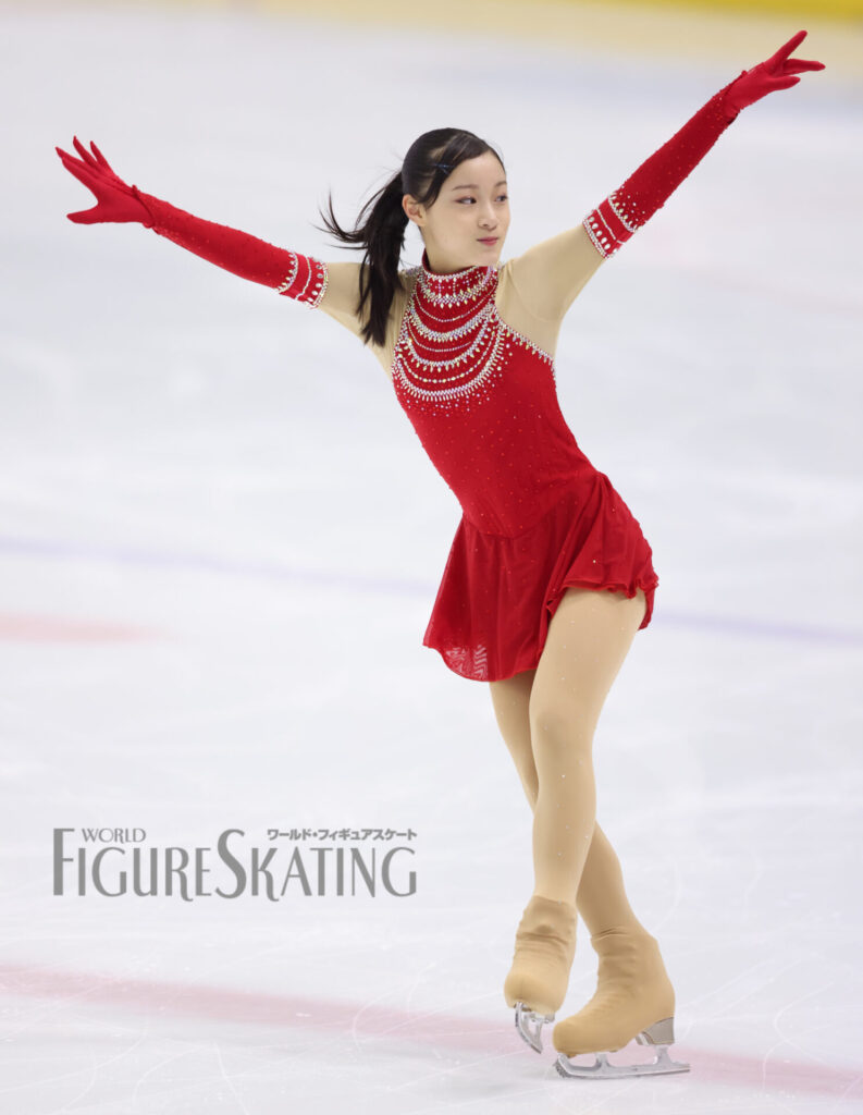 「今回の目標は、いい演技をして自己ベストを更新することでした。自己ベストは更新できなかったけど、いい演技をし、楽しんで滑れました。悔しいところもありますが、全日本ノービスで初めて2位がとれたのでうれしかったです。このプログラムは、私が人魚で、船乗りの人を魅了するというテーマだったので、ちょっとにやっとしたりとか、お客さんを魅了するつもりでやっています」