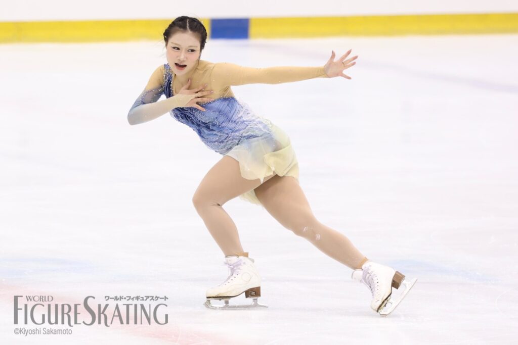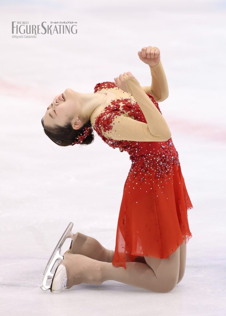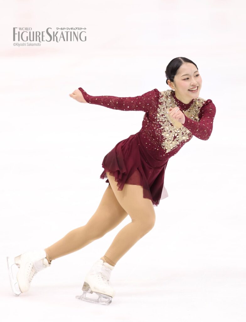 率直な感想としては、もうちょっとできたなという感じの演技ではあったんですけど、重点的にスピード感を意識して練習してきたので、それはスケーティング的な面でも、はまったジャンプがあったのも、よかったんじゃないかなと思います。ショートは合格点で、フリーは70点ぐらいです。いま日本の女子はすごく高いレベルで戦っていて、全日本となれば本当にどこの国よりも高いレベルの試合になってるんじゃないかなと思っていて。そのなかで自分も戦っていくためには、まずはジャンプを揃えるというのは当たり前のことだと思っているので、それを考えるとまだまだかなと感じました。去年の(東日本優勝の)ことは全く何も意識しなくて、自分の体感として去年よりたくさん成長した部分があると思っています。それが点数に出るか出ないかは別として、去年から1回リセットして今年はどの試合も挑めています。(「トゥーランドット」のフリーは)去年はけっこう強い音に合わせた上半身の表現が自分のなかで難しくて、そこに意識が行ってしまっていたんですけど、今年はそれに加えて、ちゃんと足元から重厚感とか盛り上がりのスピード感を出していくっていうのを意識してやっているので、そこがちょっと成長した部分かな、と思います。