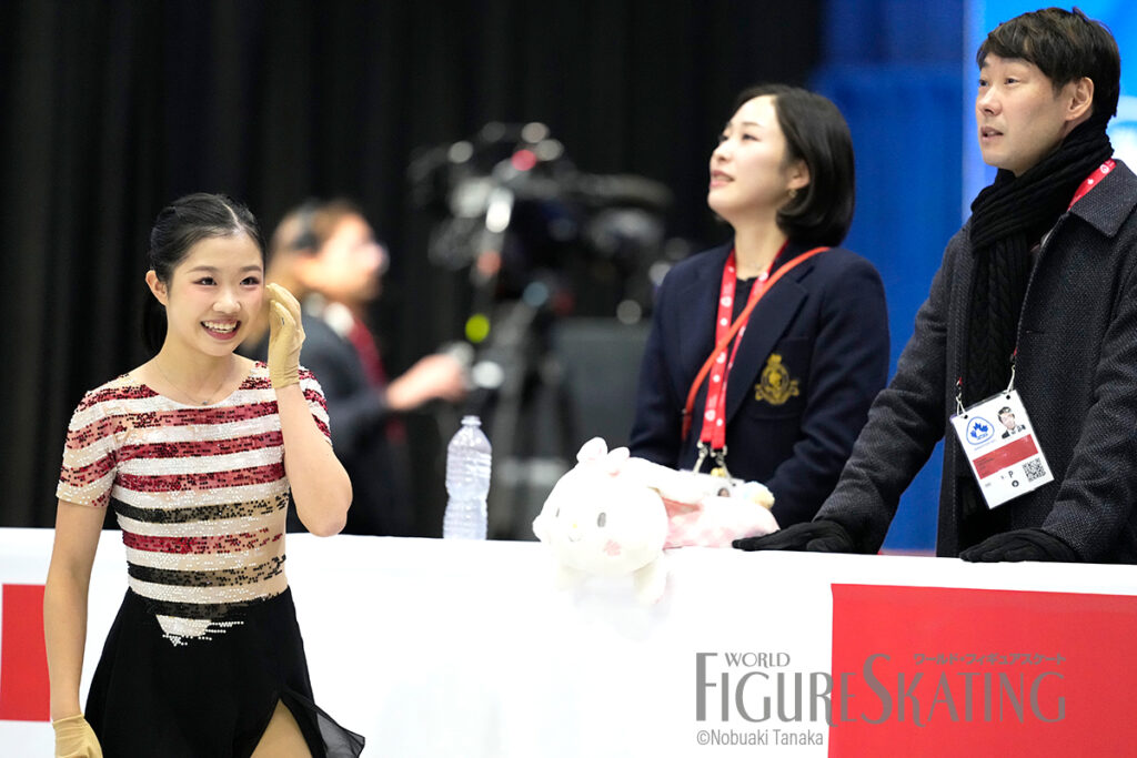 千葉百音「ベストではなかったという感じで……。すごく緊張はしていたんですけれど、濱田先生や連盟の方からは、楽しそうに滑っていたねと第一声で言っていただけたので、うまく演じることができていたのかなと。6分練習で焦って練習していて、そこから切り替えて集中し直せたのは、今日の成果かなと思います。SPは2シーズン目ということもあって、去年よりさらに大人っぽく、こなれた感じとか、曲の魅力をさらにさらに出していきたいというところが、やっぱり下の点数(演技構成点)にしっかり生きているのを見ると、自分の努力の方向性が正しいことを確認できるので、これよりさらに上を目指して、今後の試合も1つ1つしっかり演じていきたいと思います。新しい衣装は、一新という感じですが、見る人によっては濃いピンクに見えるみたいなので、ガラッと青系にすればよかったかなと思ったんですけど、この色も自分に合って気に入っているので、このフリフリ(の飾り)がチャームポイントだと思います。振付のケイトリン(・ウィーバー)さんとも、去年はティーンの若々しさで、今年は大人っぽく、身体のラインもしっかりグラマラスに見えるようにということで、このデザインができあがりました。衣装の素敵さに免じて、私もどんどん魅力的な演技ができるようにがんばります」