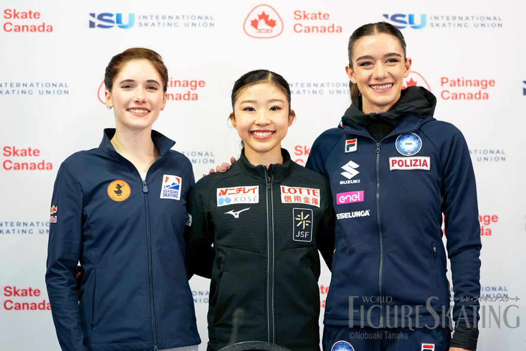 (左から)SP2位イザボー・レヴィト、1位千葉百音、3位ララ・ナキ・グットマン。上位3選手会見では、それぞれオリンピック出場がかかる各国選手権への意欲も語った ©Nobuaki Tanaka/Shutterz