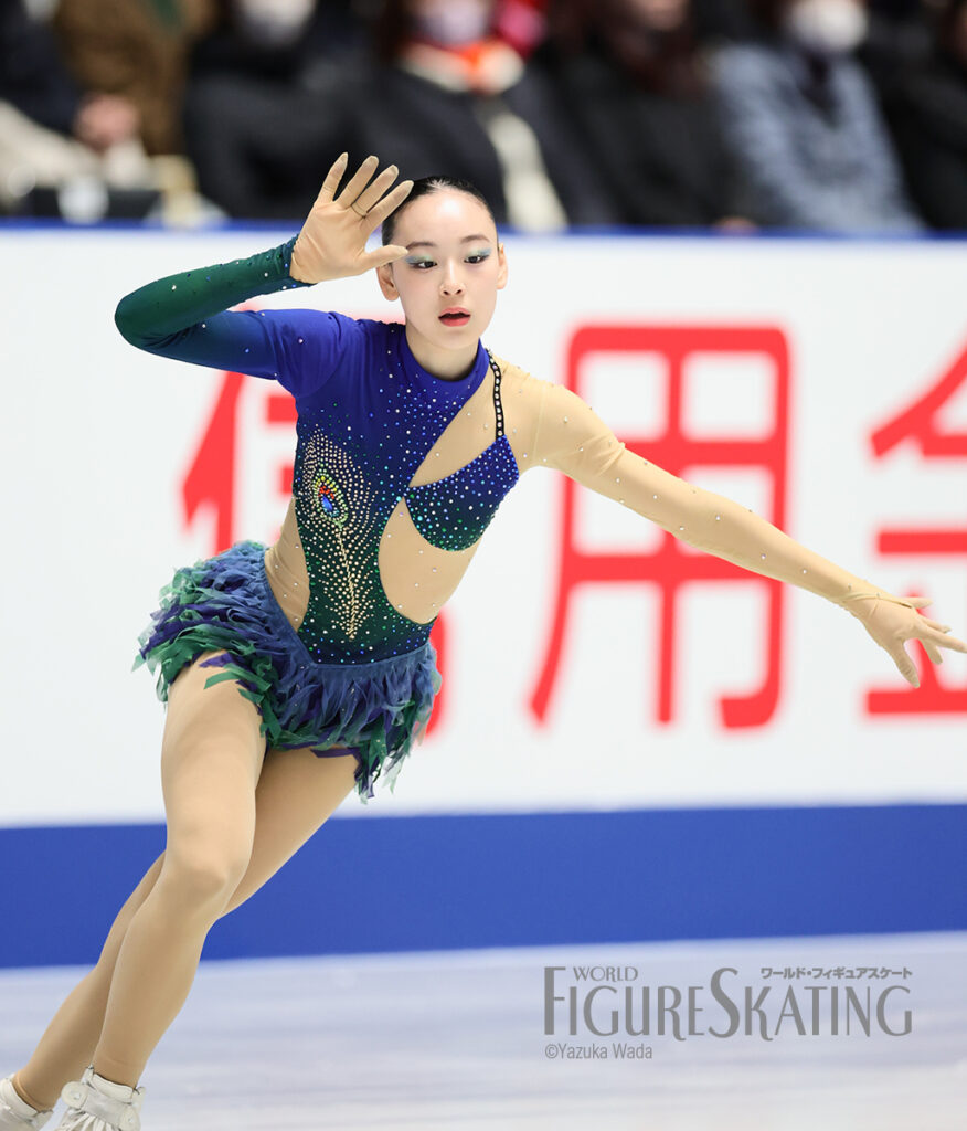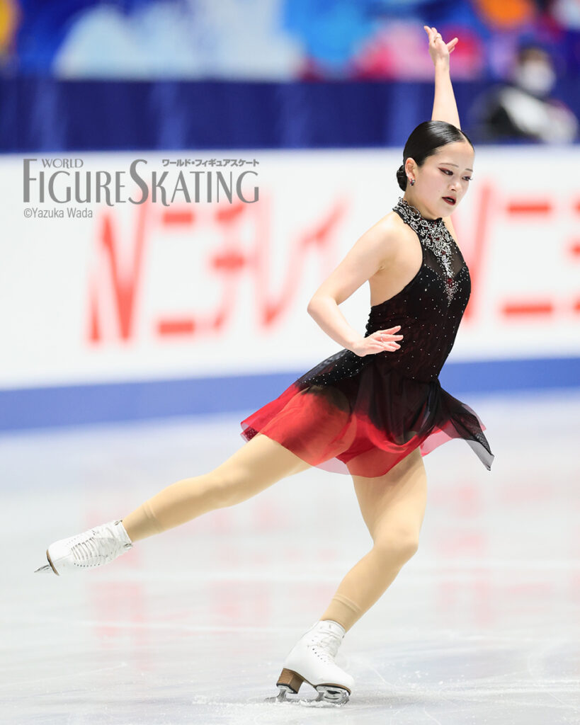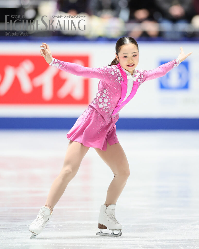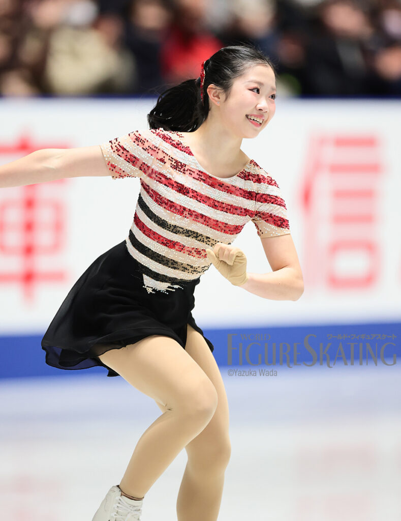 まずはノーミスで終えれたことがすごいうれしいですし、トリプルアクセルを(ショートで)初めて挑戦して、着氷することができて、すごいうれしい気持ちと、ホッとしている気持ちです。まさか70点台に乗れるとも思っていなかったし、自己ベストは更新したいっていう思いがあったので、点数が出てすごいびっくりしました。自分も先生もルッツ+トウを決めたらトリプルアクセルを入れようと決めていました。(フリーは)まずはしっかり落ち着いて、ノーミスを目指して、楽しんで、悔いの残らない演技をしたいなと思います。(全日本は)最初から楽しいっていう思いが強かったのと、歓声とか、大きく拍手をくださったりしていたので、すごい楽しく滑ることができました。