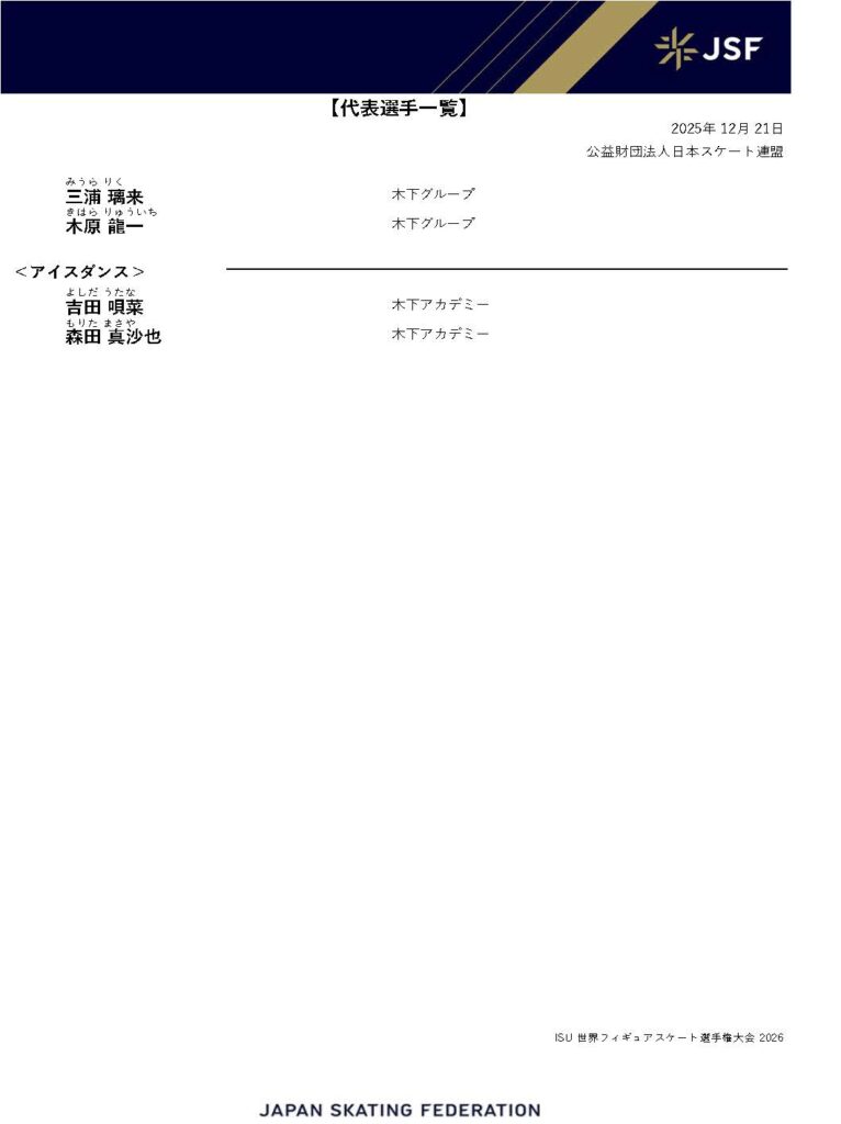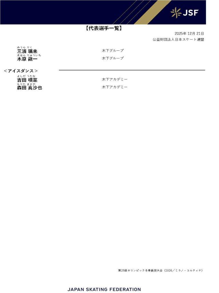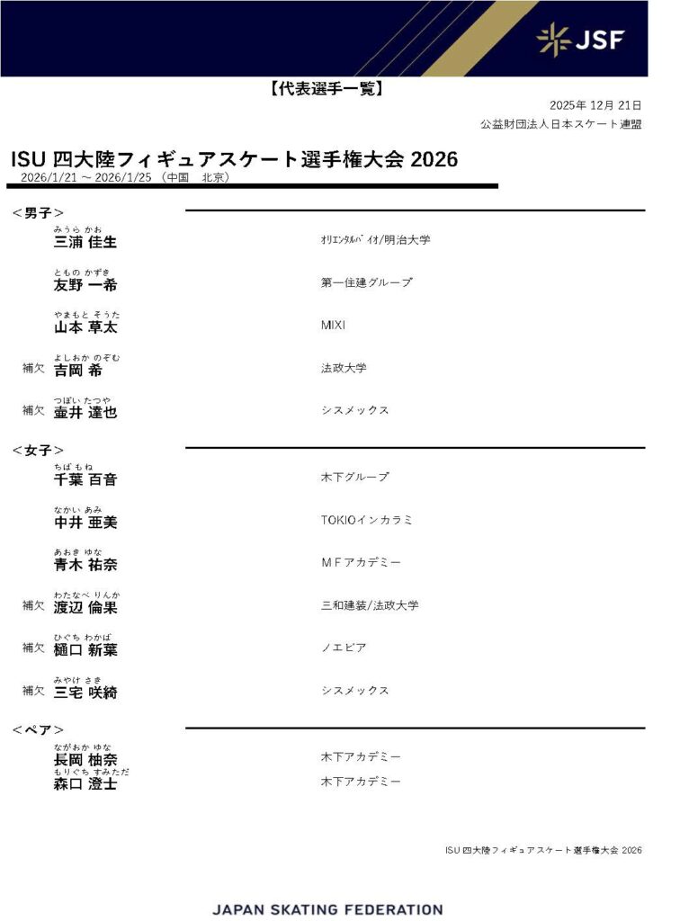 12月21日、全日本選手権の競技が終了し、日本スケート連盟が、ミラノ・コルティナ冬季オリンピックをはじめ、世界選手権、四大陸選手権、世界ジュニア選手権の代表選手を発表しました。