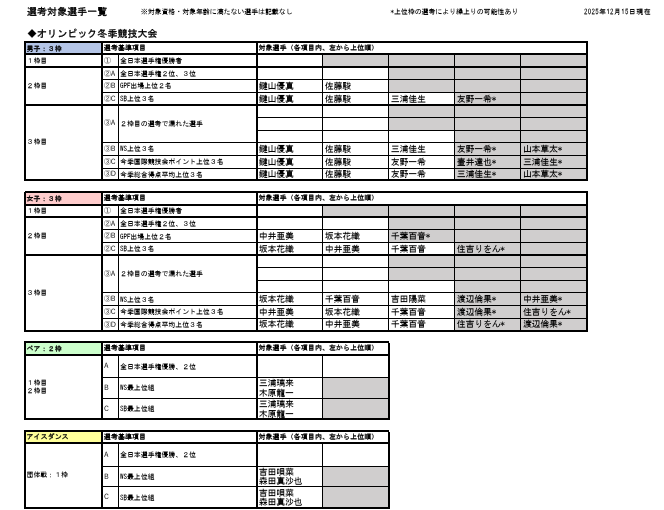 ※救済事項:最終選考会である全日本選手権への参加は必須(補欠の選考はこれに限らない)。ただし、過去に世界フィギュアスケート選手権大会3 位以内に入賞した実績のある選手が、けが等のやむを得ない理由で全日本選手権へ参加できなかった場合、不参加の理由となったけが等の事情の発生前における同選手の成績を上記選考基準に照らして評価し、大会時の状態を見通しつつ、選考することがある。(2025-26シーズン フィギュアスケート国際競技会 派遣選手選考基準より)