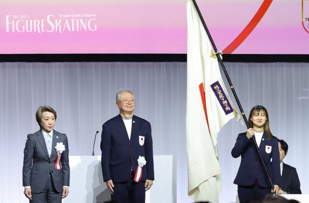 結団式には、ミラノ・コルティナ冬季オリンピックに参加する69名の選手、役員らが出席した。フィギュアスケートからは鍵山優真、佐藤駿、三浦佳生、坂本花織、中井亜美の5選手と、日本スケート連盟の竹内洋輔フィギュア強化部長らが参加し、坂本は海外遠征中である旗手の森重航(北京大会スピードスケート500m銅メダル)に代わって、旗手代行を務めた。
