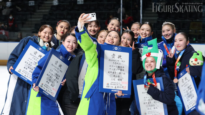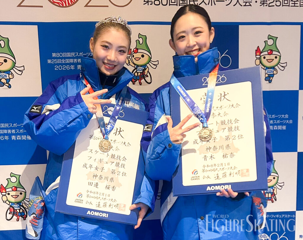 第80回国民スポーツ大会「青の煌めきあおもり国スポ」フィギュアスケート競技が、1月31日に青森県八戸市のFLAT HACHINOHEで開幕し、大会2日目の2月1日に成年女子フリーが行われました。国民スポーツ大会は都道府県対抗戦で、出場2選手の個人順位の合計で競われます。優勝は山下真瑚選手、松生理乃選手が代表の愛知、2位は青木祐奈選手、田邉桜香選手の神奈川。3位には渡辺倫果選手、聖前埜乃華選手の青森が入り、地元開催の大会で青森がうれしい初メダルを獲得しました。個人成績では、1週間前に四大陸選手権を制覇した青木祐奈選手(神奈川)が優勝、2位が山下真瑚選手(愛知)、3位が三宅咲綺選手(岡山)。以下、渡辺倫果選手(青森)、江川マリア選手(福岡)、住吉りをん選手(東京)、松生理乃選手(愛知)が続きました。表彰台に上がった上位チームの喜びのコメントを、写真とともにお届けします。