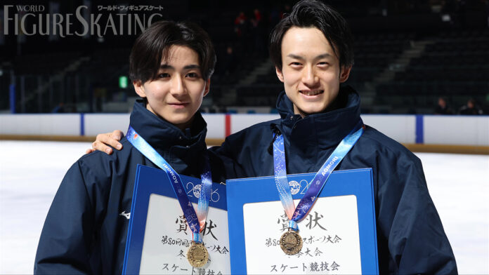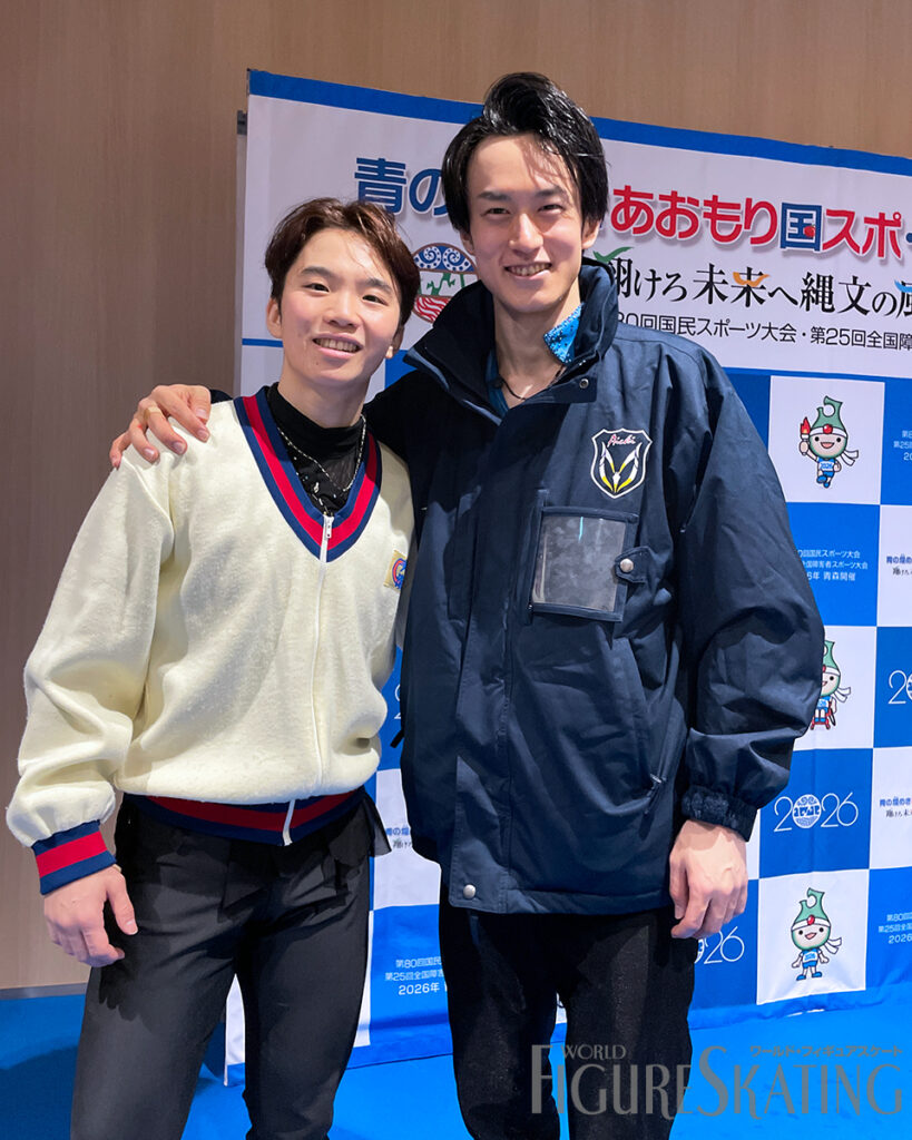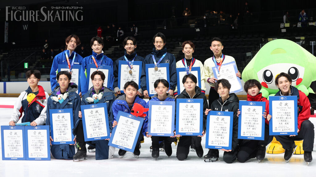 青森県八戸市で行われた第80回国民スポーツ大会(青の煌めきあおもり国スポ)フィギュアスケート競技の成年男子は、大会2日目の2月1日にフリーが行われました。代表2選手の個人順位の合計で決まる都道府県対抗は、山本草太選手、中村俊介選手が代表の愛知が成年女子に引き続いて優勝、2位が友野一希選手と朝賀俊太朗選手の大阪、3位が三宅星南選手と杉山匠海選手の岡山という結果に。個人成績は、山本草太選手(愛知)がSP、フリーともに首位で完全優勝、友野一希選手(大阪)が2位、吉岡希選手(兵庫)が3位に入り、以下は中村俊介選手(愛知)、大島光翔選手(埼玉)、朝賀俊太朗選手(大阪)と続きました。来シーズンに向けて手ごたえを掴んだ山本選手と、その山本選手に闘争心を燃やす友野一希選手のフリー後のコメント、そして優勝したチーム愛知の喜びの声を写真とともにお伝えします。