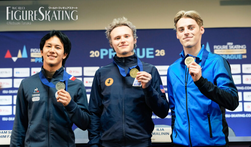 プラハで開催中の世界選手権は3月26日、男子SPが行われました。トップスリーはイリア・マリニン(アメリカ)、アダム・シャオイムファ(フランス)、アレクサンドル・セレフコ(エストニア)。日本の鍵山優真(オリエンタルバイオ/中京大学)は氷の溝にエッジが引っかかってトリプルアクセルが跳べない不運があり、それでも最初2本の質の高いジャンプと強みである演技構成点で踏みとどまって6位、練習では不調ながらも「ぎりぎりで」本番に合わせた佐藤駿(エームサービス/明治大学)が4位で、それぞれ最終グループでフリーに臨みます。三浦佳生(オリエンタルバイオ/明治大学)はジャンプが3本とも不発となり、SP25位でフリー進出を逃す波瀾の試合となりました。