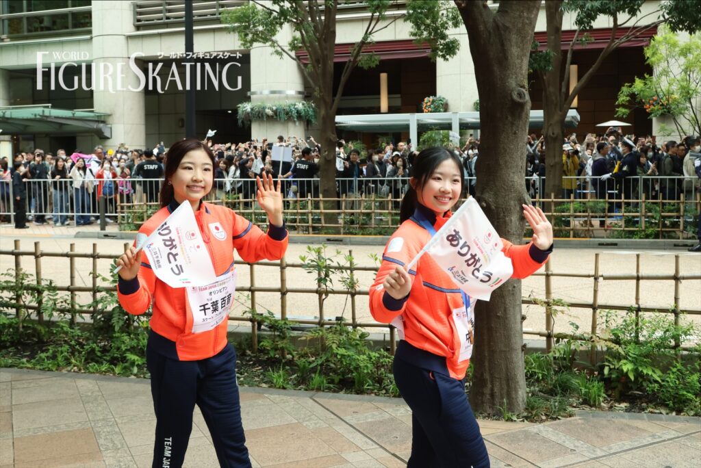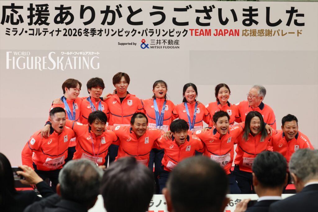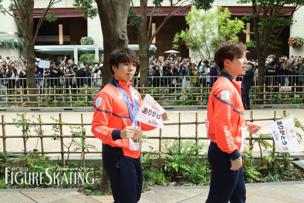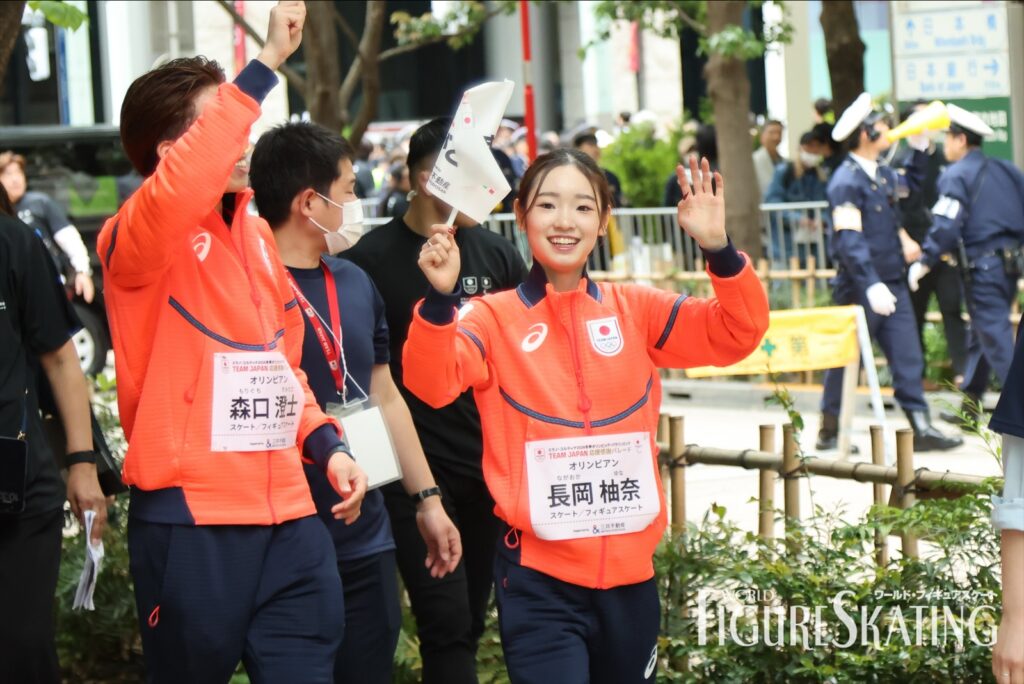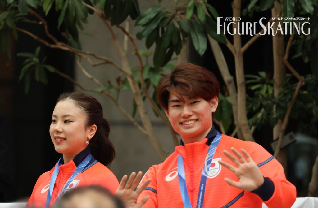 冬季大会後に日本選手団のパレードが行われるのは今回が初めて。およそ115人の選手団が8グループに分かれて、日本橋のコレド室町テラスから大通りを約700m歩き、大会期間中に声援を送った観客へ直接感謝の思いを伝える。フィギュアスケートからは、ペア金メダルの“りくりゅう”こと三浦璃来&木原龍一、女子シングル銀メダルの坂本花織、銅メダルの中井亜美、男子シングル銀メダルの鍵山優真、銅メダルの佐藤駿、団体銀メダルの吉田唄菜&森田真沙也、そして千葉百音、三浦佳生、長岡柚奈&森口澄士が参加した。